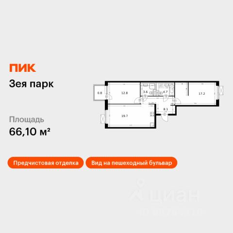 Продаётся 2-комн. квартира площадью 50 кв.м на 7 этаже 9 этажного дома (Корпус 7, Секция 1) проекта ПИК Зея парк. Светлый просторный подъезд на уровне земли, функциональная планировка, большие окна, предчистовая отделка. "Зея парк" - новый квартал со всем необходимым для комфортной жизни. До центра Благовещенска - 15 минут. Внутри "Зея парка" много места для тихих прогулок и активного отдыха. В каждом дворе будет парк с детскими и спортивными площадками. Рядом с домами пройдёт широкий пешеходный бульвар, где мы установим удобные скамейки и высадим кустарники и цветы и взрослые деревья. В квартиры и дворы сможет беспрепятственно проникать солнце благодаря переменной высоте корпусов - 9 и 16 этажей. В домах будут просторные и светлые подъезды с дизайнерской отделкой, витражным остеклением и двумя выходами на уровне земли: во двор и на улицу. В квартирах большие окна, застеклённые балконы и лоджии — будет светло и уютно даже зимой. Все квартиры сдаются с предчистовой отделкой: самые грязные и шумные работы к моменту выдачи ключей уже закончатся. На первых этажах домов разместятся магазины, кафе и другие сервисы, а на подземных — индивидуальные кладовые. В 1013 минутах пути на машине — парк Дружбы, аквапарк "Плаза" и ТРЦ "Острова". Рядом с жилым кварталом есть автобусная остановка, от которой можно добраться в любую часть города. Артикул 910238 (Застройщик ООО "СЗ "ПИК Благовещенск") Купить 2-комнатную квартиру с отделкой в Амурской области.