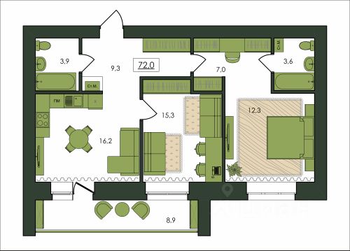 • ✓ Самая большая площадь: 72 м²