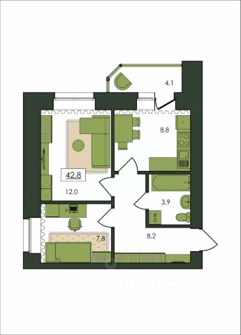 • ✓ Минимальная площадь: 42,6 м²