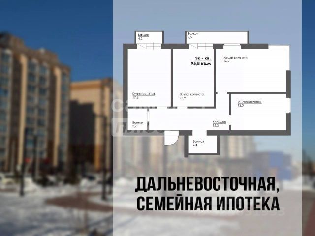 Продаётся 3-комн. квартира площадью 67,7 кв.м на 7 этаже 9 этажного дома (Корпус 7, Секция 1) проекта ПИК Зея парк. Светлый просторный подъезд на уровне земли, функциональная планировка, большие окна, предчистовая отделка. "Зея парк" - новый квартал со всем необходимым для комфортной жизни. До центра Благовещенска - 15 минут. Внутри "Зея парка" много места для тихих прогулок и активного отдыха. В каждом дворе будет парк с детскими и спортивными площадками. Рядом с домами пройдёт широкий пешеходный бульвар, где мы установим удобные скамейки и высадим кустарники и цветы и взрослые деревья. В квартиры и дворы сможет беспрепятственно проникать солнце благодаря переменной высоте корпусов - 9 и 16 этажей. В домах будут просторные и светлые подъезды с дизайнерской отделкой, витражным остеклением и двумя выходами на уровне земли: во двор и на улицу. В квартирах большие окна, застеклённые балконы и лоджии — будет светло и уютно даже зимой. Все квартиры сдаются с предчистовой отделкой: самые грязные и шумные работы к моменту выдачи ключей уже закончатся. На первых этажах домов разместятся магазины, кафе и другие сервисы, а на подземных — индивидуальные кладовые. В 1013 минутах пути на машине — парк Дружбы, аквапарк "Плаза" и ТРЦ "Острова". Рядом с жилым кварталом есть автобусная остановка, от которой можно добраться в любую часть города. Артикул 910241 (Застройщик ООО "СЗ "ПИК Благовещенск") Продам 3-комнатную квартиру с двумя санузлами в Амурской области.