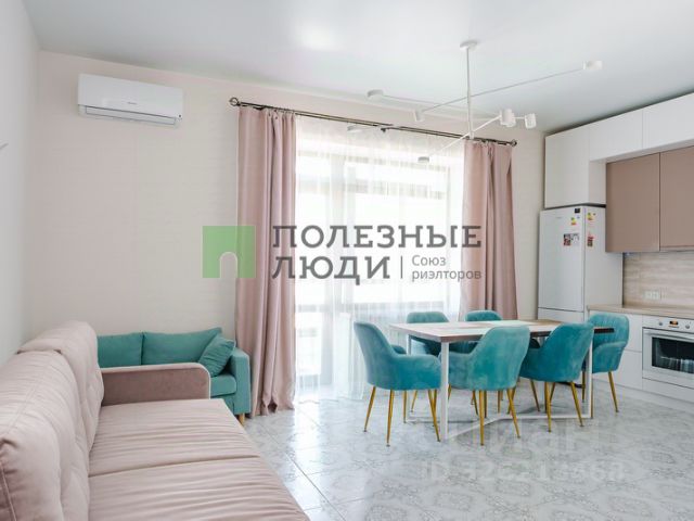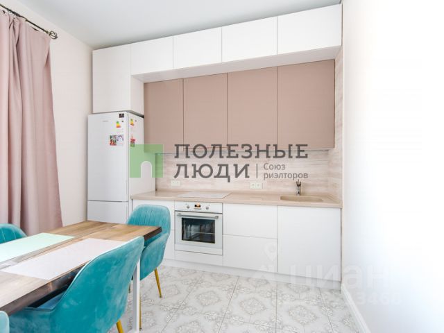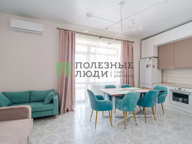 Кухня-гостиная заслуживает отдельного внимания: просторная, уютная, от неё будет в восторге любая хозяйка. Установлен красивый кухонный гарнитур кремово-белого цвета, каменная столешница с встроенной мойкой придают кухне богатство и делают её практичной в эксплуатации. Кухня оборудована современной бытовой техникой: индукционная варочная панель, независимый духовой шкаф, вытяжка и холодильник. Вместительная обеденная зона оснащена добротным прямоугольным столом из натурального массива дерева, стол вмещает за собой до 8 персон, в комплекте со столом идут удобные, мягкие стулья. Так же в гостиной расположился диван , на нём можно приятно коротать вечера за просмотром любимых фильмов.