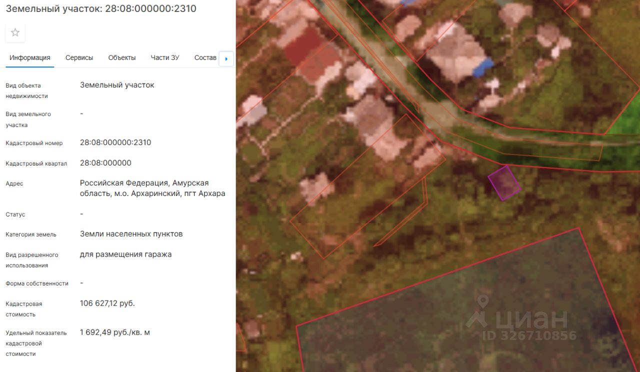 Земельный участок с кадастровым номером 28:08:000000:2310 площадь 63 по адресу Российская Федерация, Амурская область, м.о. Архаринский, пгт Архара
