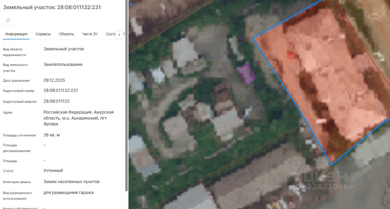 Земельный участок с кадастровым номером 28:08:011132:231 площадь 26 по адресу Российская Федерация, Амурская область, м.о. Архаринский, пгт Архара
