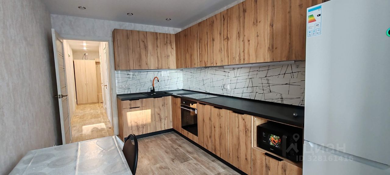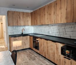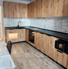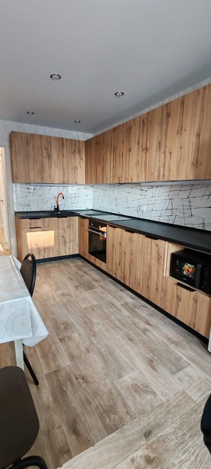 - укомплектованная кухня: кухонный гарнитур, со встроенной техникой варочная поверхность, духовым шкафов, вытяжкой, микроволновая печь, холодильник, посуда;