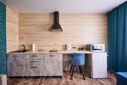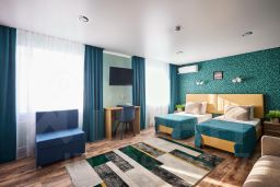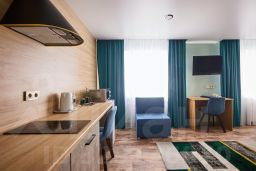 Элегантный однокомнатный номер общей площадью 35 кв.м., сочетающий современный стиль и уют, состоит из просторной прихожей, спальни с зоной для отдыха, оборудованной кухонным гарнитуром, большой ванной комнатой с душевой кабиной. Номер содержит все необходимое для комфортного проживания и отдыха: спальня-гостиная с диваном, две односпальные кровати (90*200), полный санузел с душевой кабиной, ЖК телевизор, телефон, холодильник, микроволновая печь, электроплита, набор посуды, кондиционер, Wi-fi, бутилированная вода, фен, чайная станция. Из окон номеров открывается вид на набережную реки Амур и приграничный город Хэйхэ (КНР).