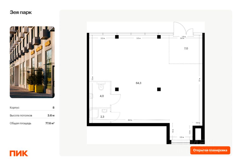 - Открытая планировка и возможность объединения помещений