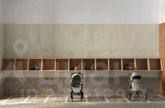 Закрытый двор без машин только для жителей. Крытая система хранения детского транспорта во дворе.
