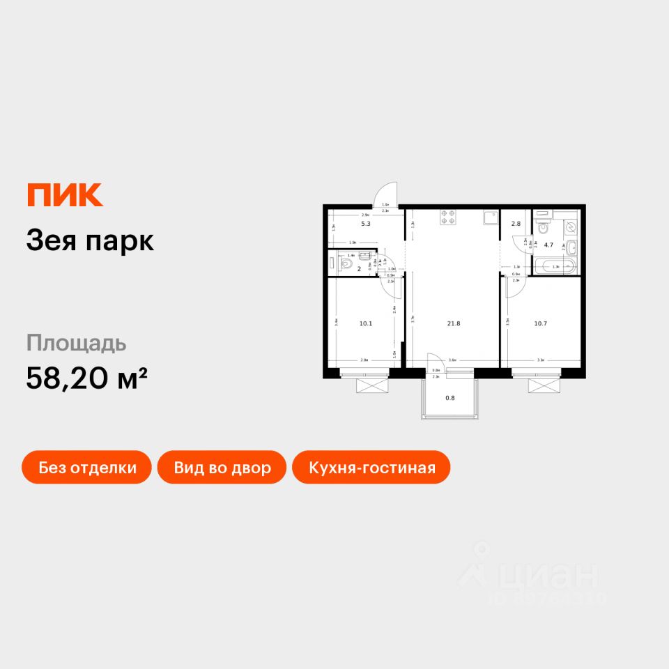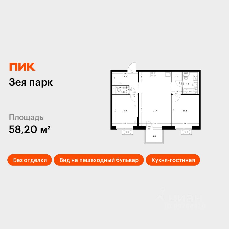 Продаётся 2-комн. квартира площадью 58,2 кв.м на 6 этаже 9 этажного дома (Корпус 3, Секция 1) проекта ПИК Зея парк. Светлый просторный подъезд на уровне земли, функциональная планировка, большие окна, без отделки.