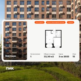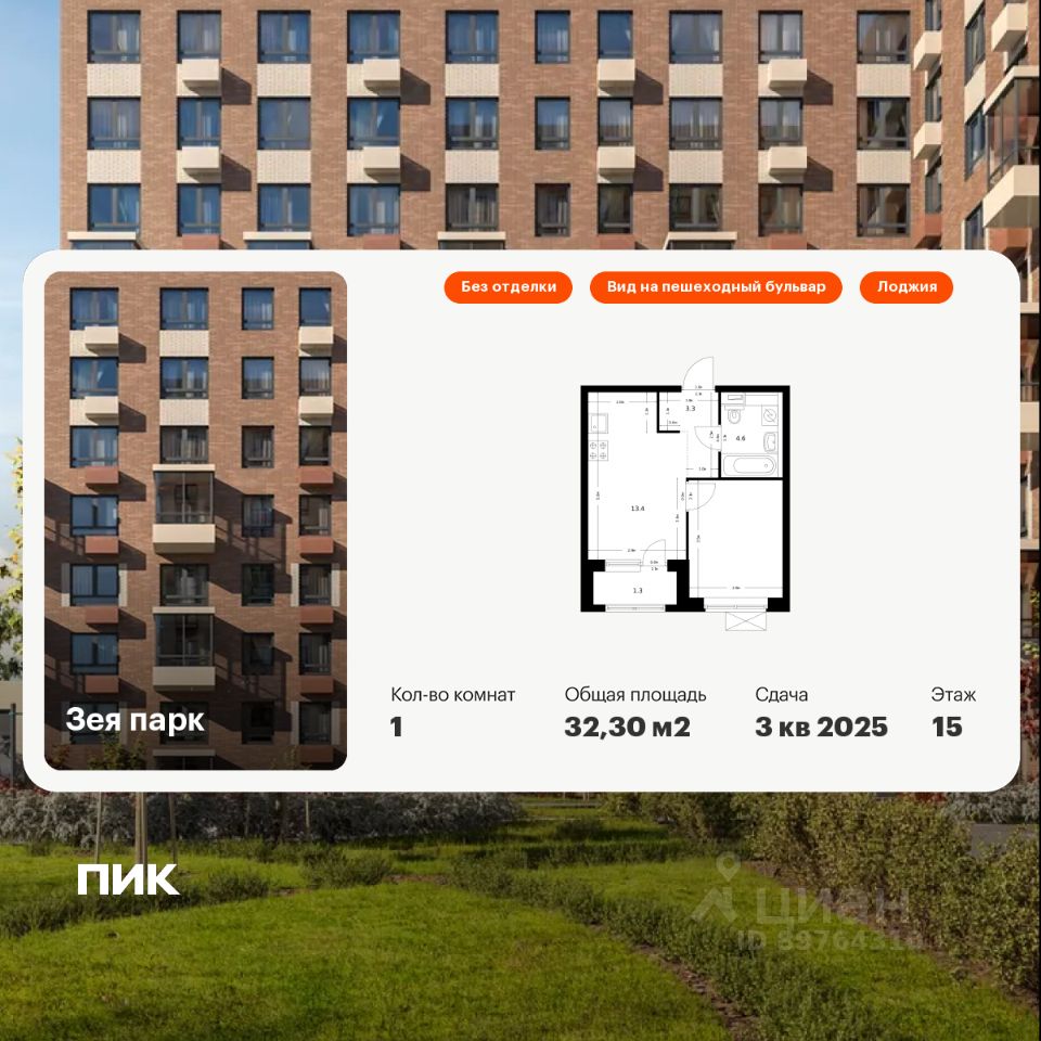 Продаётся 1-комн. квартира площадью 32,3 кв.м на 15 этаже 16 этажного дома (Корпус 2, Секция 1) проекта ПИК Зея парк. Светлый просторный подъезд на уровне земли, функциональная планировка, большие окна, без отделки.