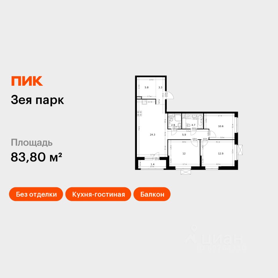 Продаётся 3-комн. квартира площадью 83,8 кв.м на 10 этаже 16 этажного дома (Корпус 4, Секция 1) проекта ПИК Зея парк. Светлый просторный подъезд на уровне земли, функциональная планировка, большие окна, без отделки.