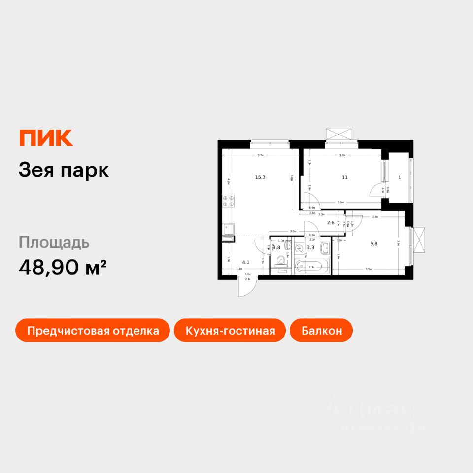 Продаётся 2-комн. квартира площадью 48,9 кв.м на 10 этаже 16 этажного дома (Корпус 2, Секция 1) проекта ПИК Зея парк. Светлый просторный подъезд на уровне земли, функциональная планировка, большие окна, предчистовая отделка.