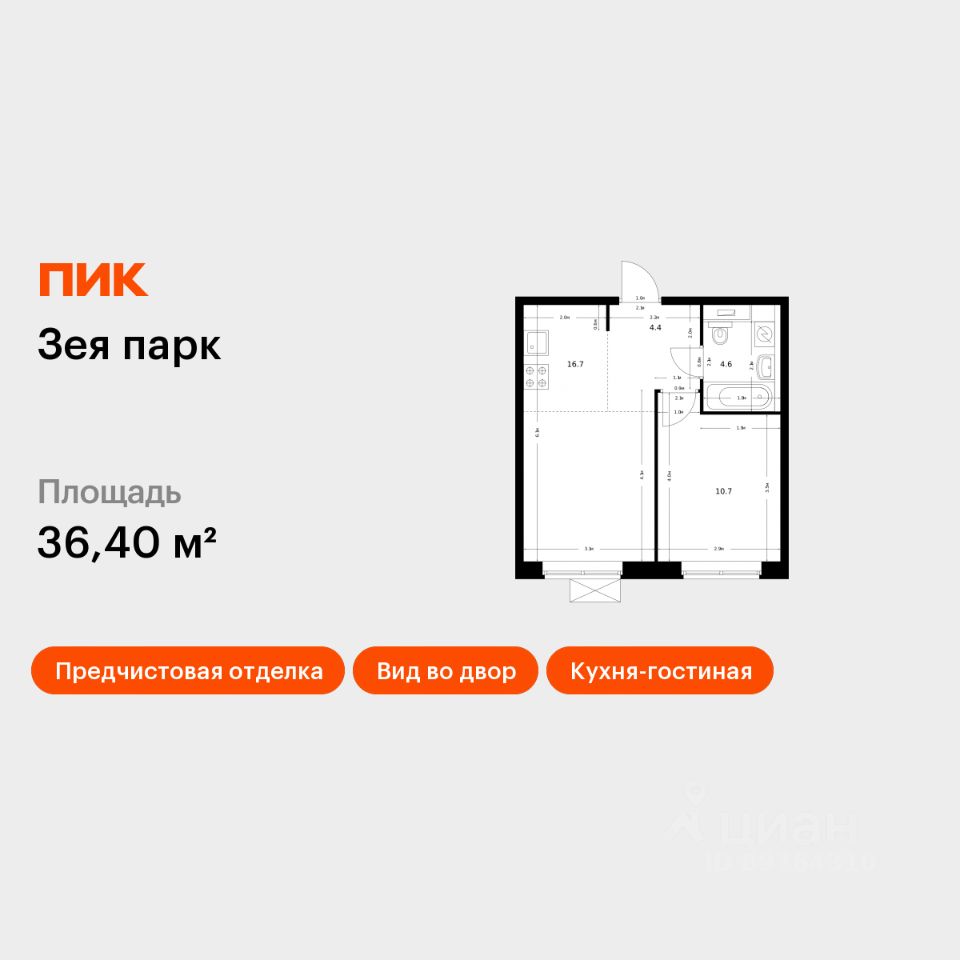 Продаётся 1-комн. квартира площадью 36,4 кв.м на 8 этаже 9 этажного дома (Корпус 3, Секция 1) проекта ПИК Зея парк. Светлый просторный подъезд на уровне земли, функциональная планировка, большие окна, предчистовая отделка.