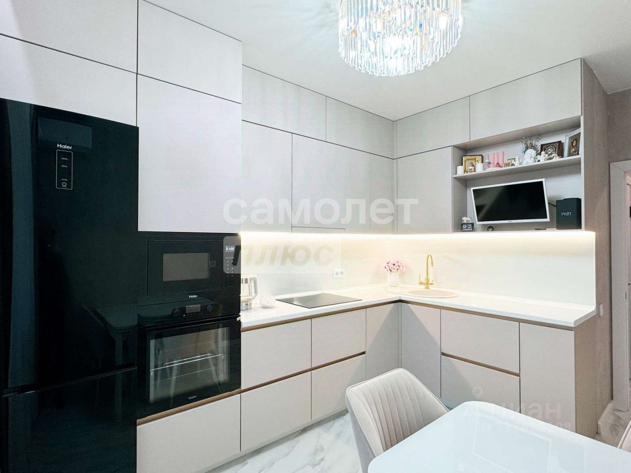 На кухне установлен кухонный гарнитур (под потолок) со встроенной бытовой техникой производства "Наiеr": духовой шкаф, мкр-печь, холодильник, посудомоечная машина, варочная поверхность, выделено место под ТВ- зону.