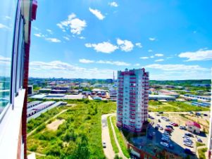 удобная планировка: уютная гостиная с рабочей зоной, застеклённый балкон, совмещённый санузел в кафеле;