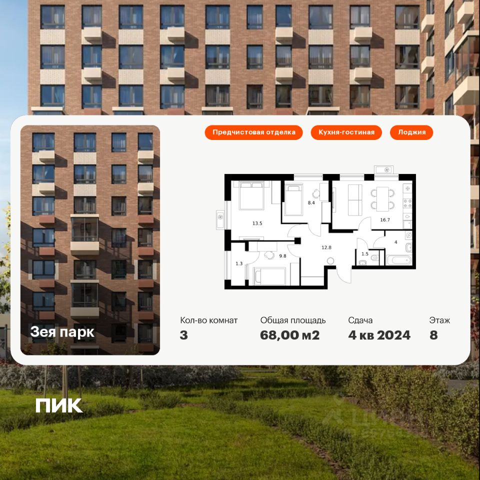 Продаётся 3-комн. квартира площадью 68 кв.м на 8 этаже 9 этажного дома (Корпус 7, Секция 1) проекта ПИК Зея парк. Светлый просторный подъезд на уровне земли, функциональная планировка, большие окна, предчистовая отделка.