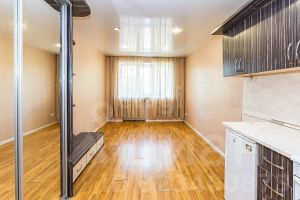 В комнате есть зона кухни (небольшой гарнитур, вытяжка, плита), шкаф-купе и полка под телевизор.