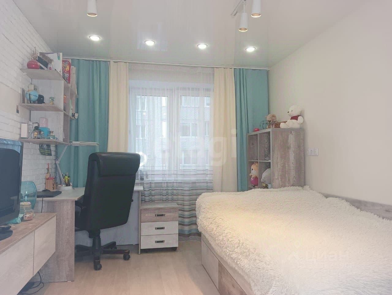В спальне предусмотрена удобная и просторная гардеробная комната. Ремонт выполнен в светлых тонах, что усиливает ощущение простора и света. Во всех комнатах установлены натяжные потолки.
