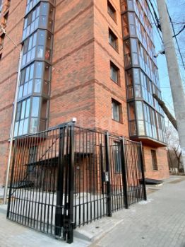 Закрытая территория с двумя въездами с автоматическими воротами и парковкой.