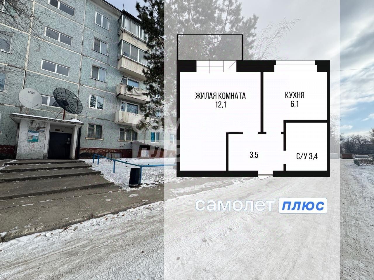 Общая площадь: 25,5 м2, из них 12.1 м2 - жилая комната и 6.1 м2 - кухня.