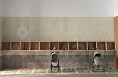 Закрытый двор без машин только для жителей. Крытая система хранения детского транспорта во дворе.