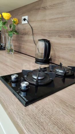 В кухне установлен новый функциональный гарнитур со встроенной техникой, включая посудомоечную машину, что значительно упрощает быт.