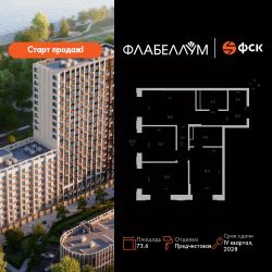 Продаётся 3-к квартира номер 121 общей площадью 73.6 кв.м. на 13-м этаже 16 этажного здания. Отделка Whitebox.