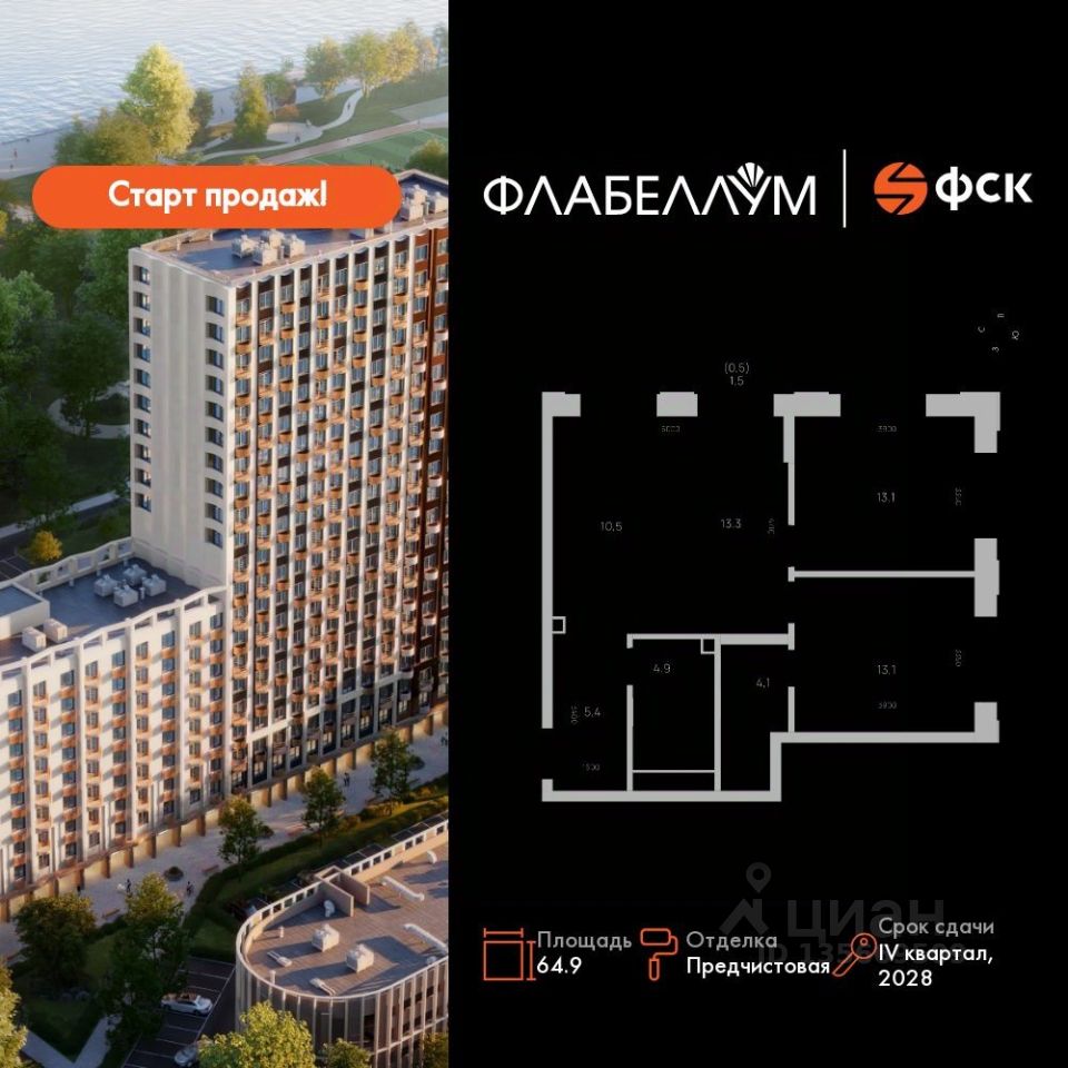 Продаётся 3-к квартира номер 126 общей площадью 64.9 кв.м. на 13-м этаже 16 этажного здания. Отделка Whitebox.