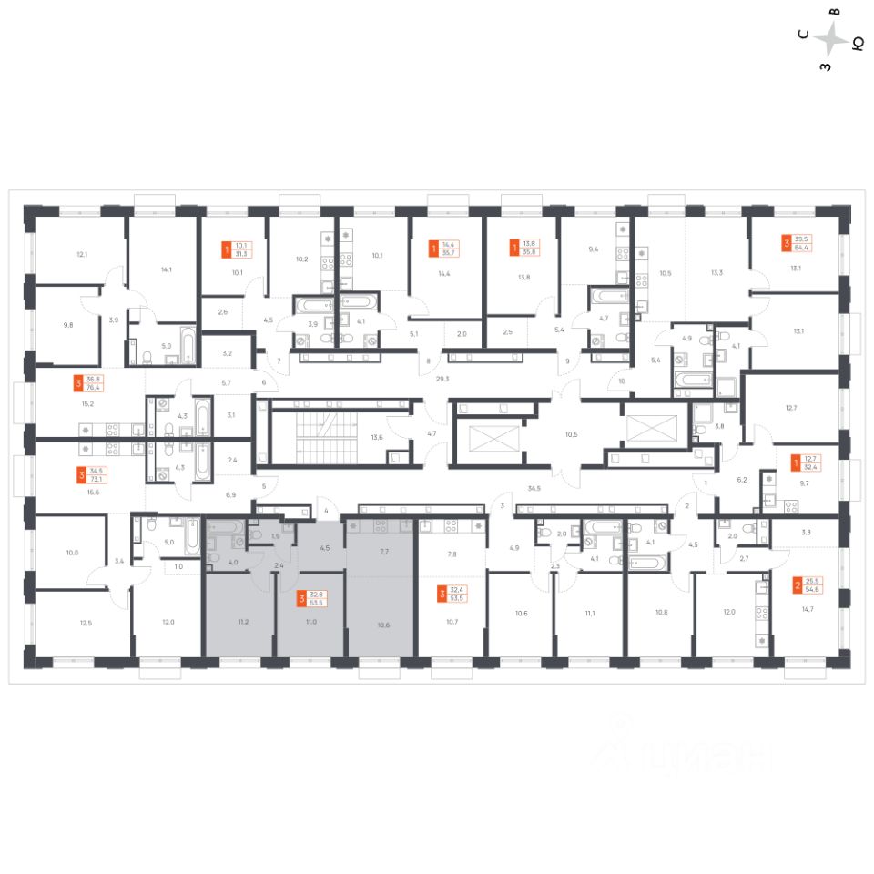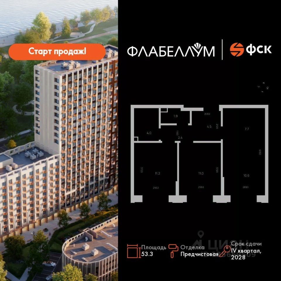 Продаётся 3-к квартира номер 10 общей площадью 53.3 кв.м. на 2-м этаже 16 этажного здания. Отделка Whitebox.
