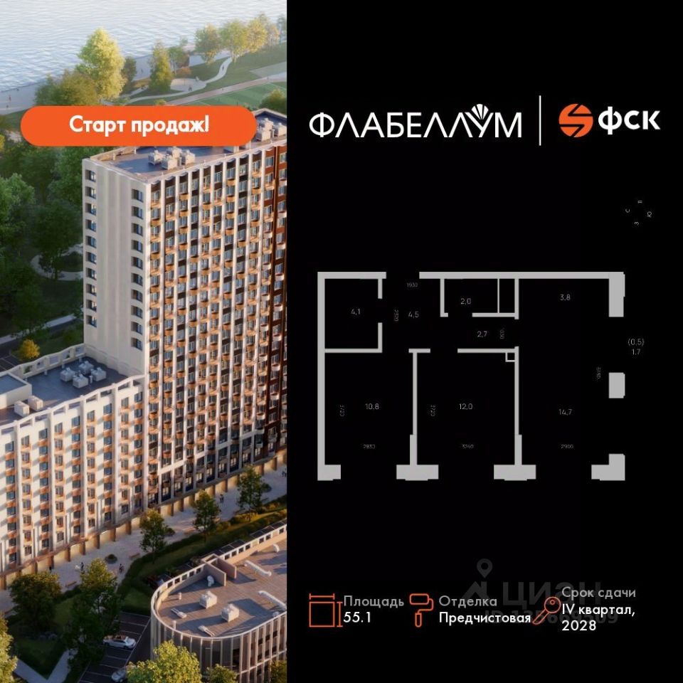 Продаётся 2-к квартира номер 78 общей площадью 55.1 кв.м. на 9-м этаже 16 этажного здания. Отделка Whitebox.