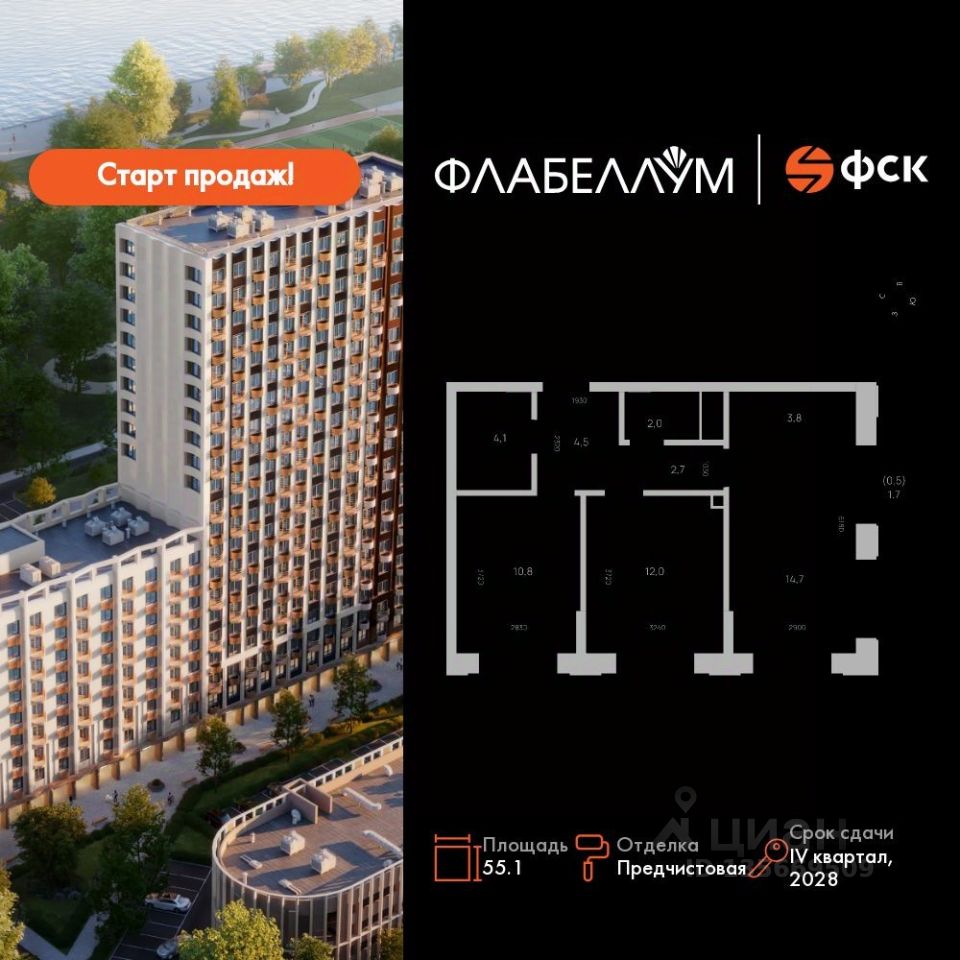 Продаётся 2-к квартира номер 138 общей площадью 55.1 кв.м. на 15-м этаже 16 этажного здания. Отделка Whitebox.