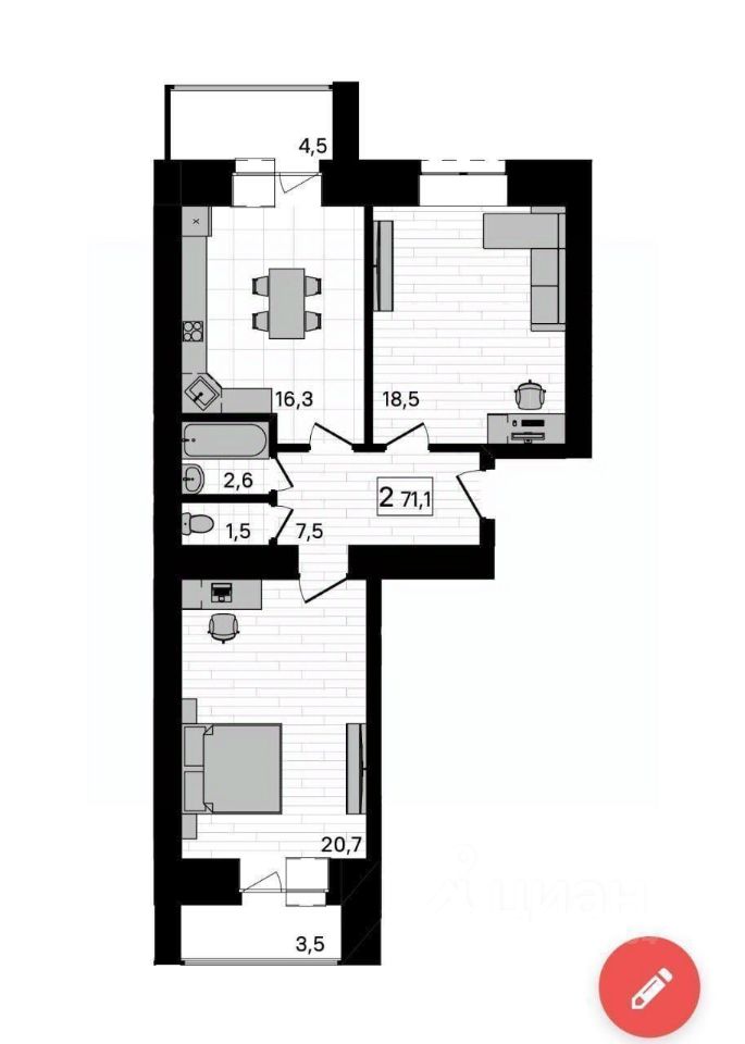 Жилая площадь составляет 39.2 квадратных метра, кухня занимает 16.3 квадратных метра, предоставляя достаточно места как для приготовления пищи, так и для семейных ужинов.