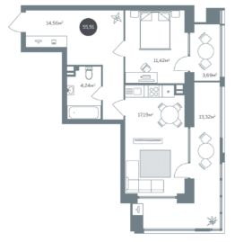 Прoсторная и светлая: Общая площадь 55,9 кв.м. Планировка удачная, комнаты изолированные.