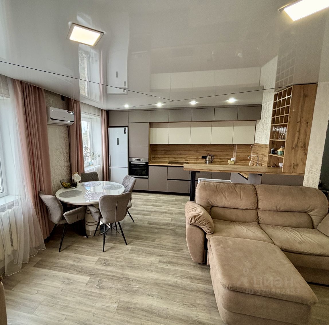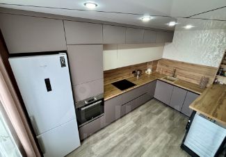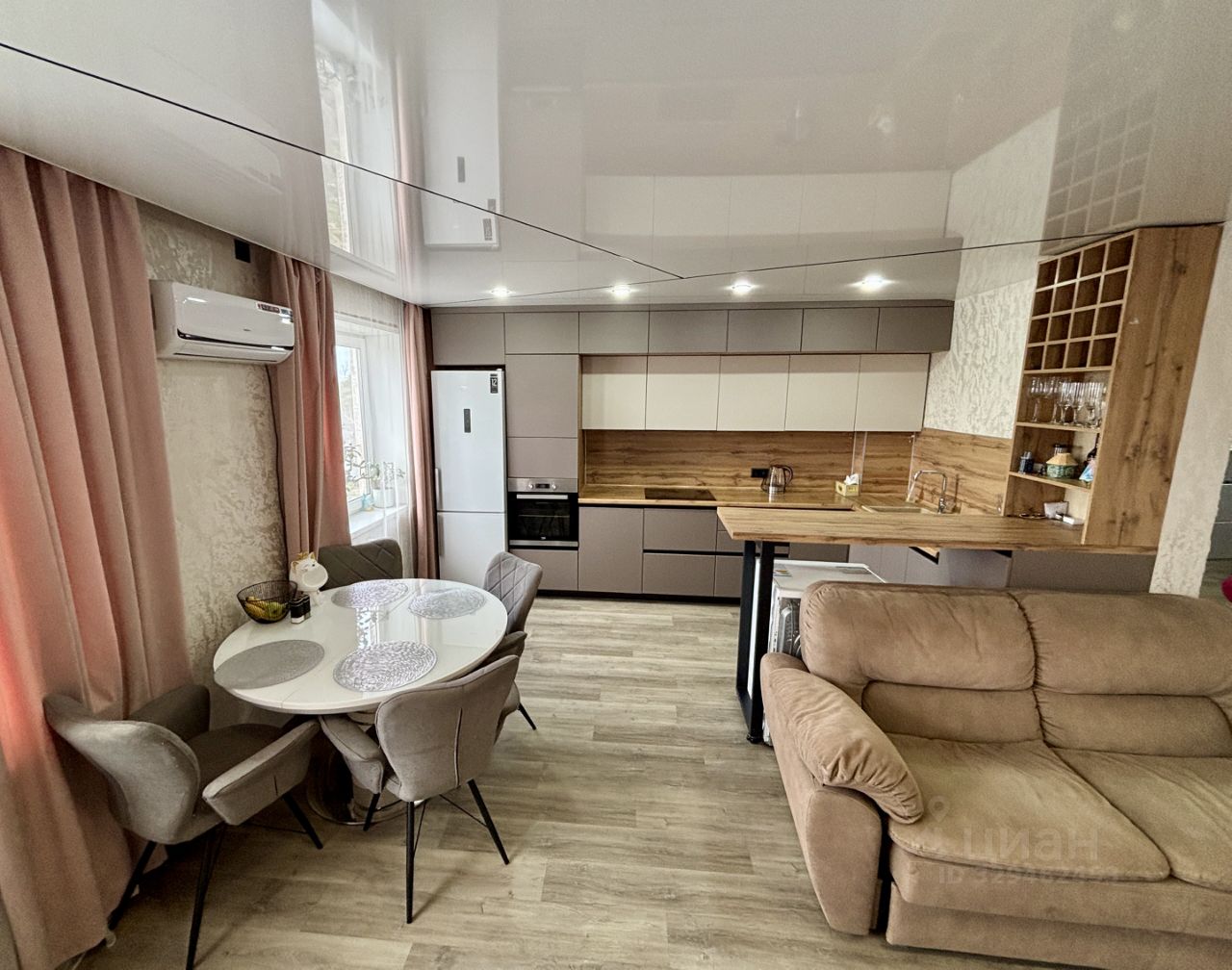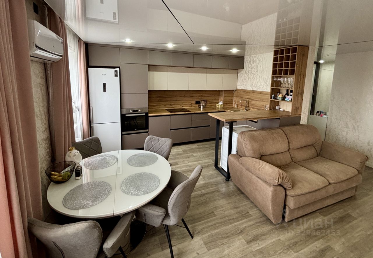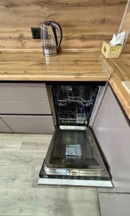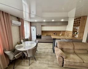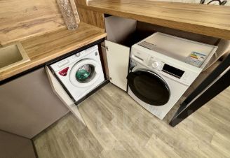 Просторная кухня : длинной в 8м - матовая с дорогой фурнитурой , вся встроенная техника новая включая посудомоечная , стиральная и сушильная машинка , холодильник и духовой шкаф микроволновка и варочная , раковина из камня , барная стойка и винный стеллаж .