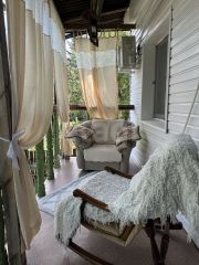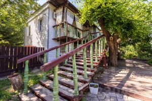 На 2 этаж ведет большая резная лестница. Здесь расположены 3 раздельные комнаты и большая кухня-гостиная, а также санузел. В доме установлен интернет. Ремонт сделан в светлых спокойных тонах. Здесь много солнечного света благодаря множеству окон. Есть возможность обустроить открытую веранду на 2 этаже с шикарным видом на сад.