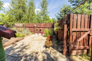 Территория возле дома выложена настилом, есть мангальная зона, качеля, место для тренировок.